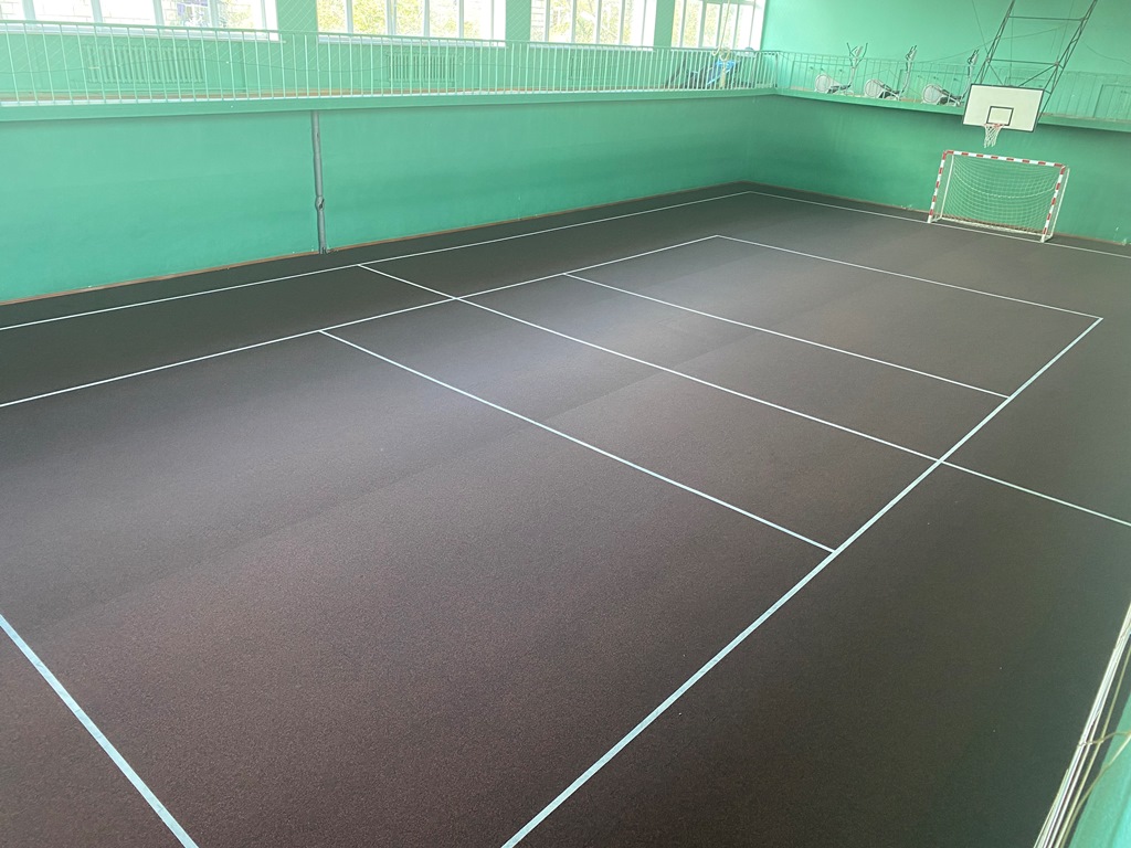 Учитывая большой объём тренировочных занятий в спортзале было выбрано современное покрытие. На нём можно играть и мини-футбол, и в баскетбол, и в волейбол.